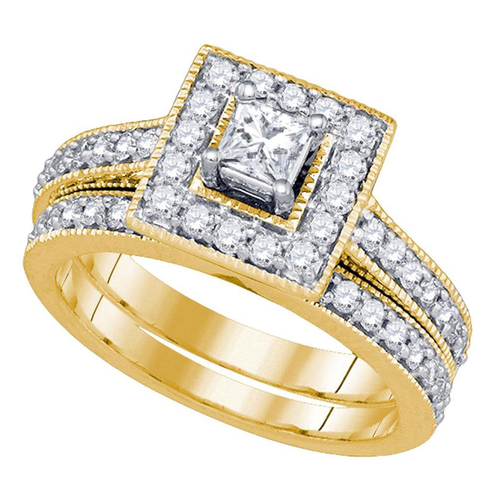 This bridal set is called '1 CT-Diamond 1/3CT-CPR BLISS BRIDAL SETS SINGLE HALO'. It features a stunning 14kt yellow gold band with a total weight of 6.896 grams. The set...