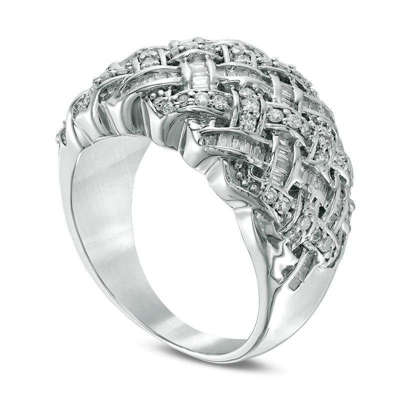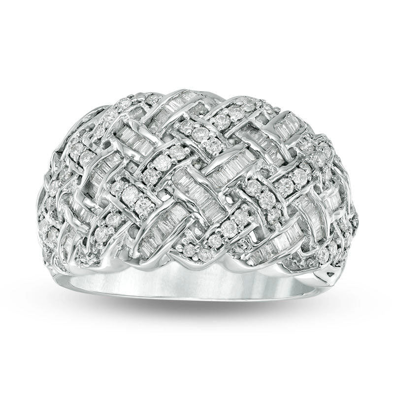 Spectacular and elegant, this 10K white gold ring features a stunning lattice design adorned with sparkling diamonds. With a combination of round and baguette-cut diamonds totaling 1 ct. t.w., this mesmerizing piece is sure to capture attention. Perfect for a sophisticated and stylish woman, this woven band is polished to a bright shine and is a timeless gift that she will cherish for years to come.