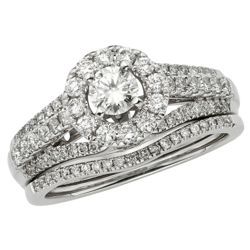 Manufactured in 14K white gold, this bridal engagement ring set showcases a 1/3 ct. certified diamond center stone boasting a color ranking of I and clarity ranking of I2. A frame of smaller round diamonds surrounds the center stone while additional round diamonds line the ring's triple row shank. All diamonds on this bridal set are natural and earth mined.