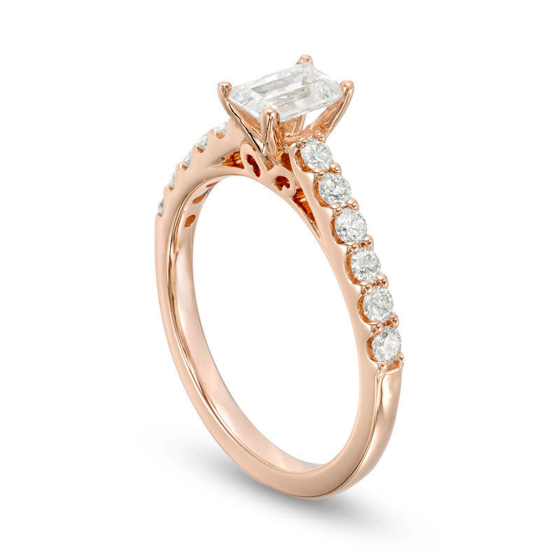 Celebrate your love with this exquisite certified diamond engagement ring. Fashioned in a stunning 14K rose gold setting, this ring is sure to take her breath away. The center stone is a 1/2 ct. certified emerald-cut diamond with a color rank of I and clarity of I1, which enhances its appeal and value. The slender shank is adorned with shimmering round diamonds that add even more sparkle to this already stunning ring. With a total weight of 1 ct. t.w., this ring is truly a magnificent choice for the one you love. As an added bonus, this ring comes with a certificate that includes a photo and description of the diamond ensuring its quality and value, and also can be used for insurance purposes. Make your moment magical with this impressive engagement ring that will be treasured for a lifetime.