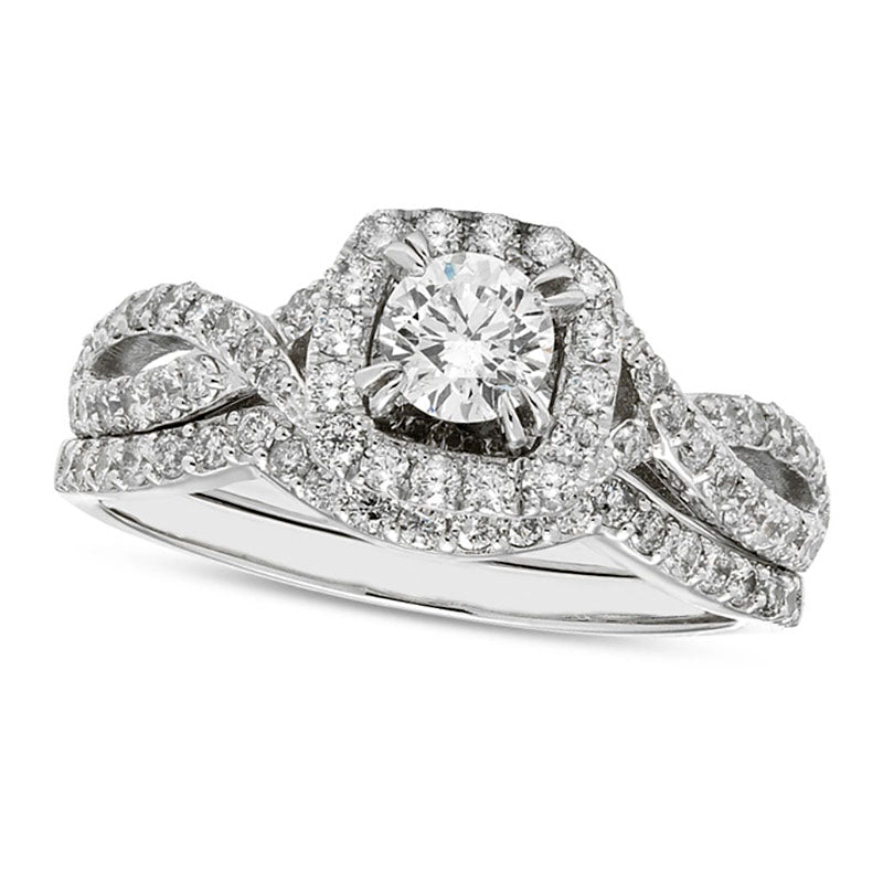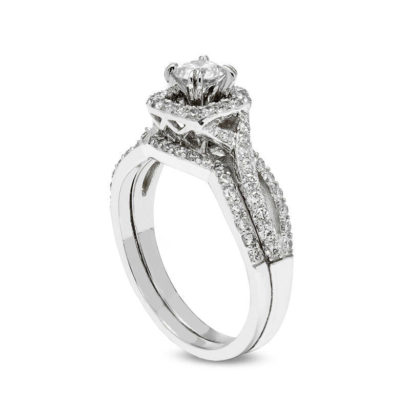 Celebrate every special moment with this stunning certified diamond bridal set. It is skillfully crafted in lustrous 14K white gold and boasts a 1/3 ct. certified diamond center stone with an I color rank and I2 clarity. The center stone is surrounded by a cushion-shaped halo frame encrusted with sparkling diamonds. The open shank of the engagement ring twirls around the finger while shimmering with captivating diamonds. This set is completed by a coordinating contoured diamond band, which adds an extra layer of elegance. With a total of 1 ct. t.w. of dazzling diamonds and a brilliant buffed luster, this bridal set truly represents the love that you share with your partner. It comes with a certificate that includes a photo and description of the diamonds, providing assurance of their quality and can be used for insurance purposes.