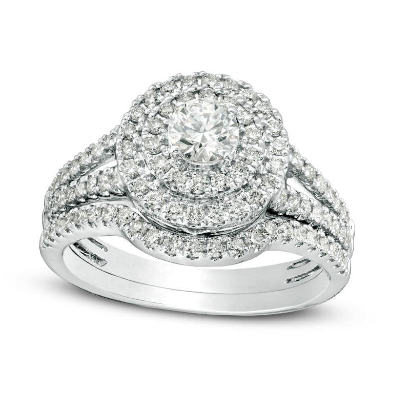 Elevate your love with a diamond bridal set that exudes timeless elegance. This 14K white gold set features a stunning engagement ring that boasts a sparkling 1/3 ct. diamond wrapped in two halo frames of diamonds. Adorned with additional diamonds along the split shank, this ring is the epitome of luxury. The coordinating wedding band is also lined with diamonds, adding a touch of sophistication to your special day. Each diamond in this bridal set is certified, guaranteeing quality with a color rank of I and clarity of I1. With a total weight of 1 ct. t.w., this set radiates brilliance and beauty. This style comes with a certificate that includes a photo and description of the diamond, which can be used for insurance purposes. Enthrall your loved one with this stunning diamond bridal set that will be cherished for a lifetime.