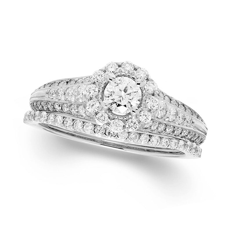 Capture her heart and fulfill her dreams with this incredible certified diamond bridal set. Made with luxurious 14K white gold, this set features an engagement ring with a sparkling 1/3 ct. diamond center stone that is encompassed by a halo of smaller diamonds. The shank of the ring tapers off with a unique rolled design of three rows of diamonds in varying sizes. Complementing this stunning engagement ring is a coordinating diamond wedding band. All diamonds within this impeccable set boast a color rank of I and clarity of I1. With an impressive total weight of 1 ct. t.w., this bridal set shines brilliantly and radiates a stunning luster. Included with this set is a certificate with a photo and description of the diamonds, guaranteeing quality and serving as insurance. Make her dreams come true with this fabulous diamond bridal set.