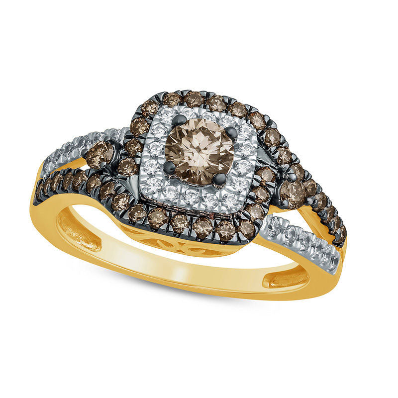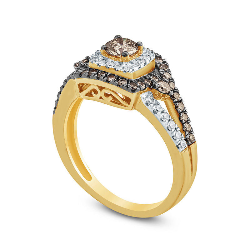 1.0 CT. T.W. Champagne and White Natural Diamond Frame Split Shank Engagement Ring in Solid 10K Yellow Gold