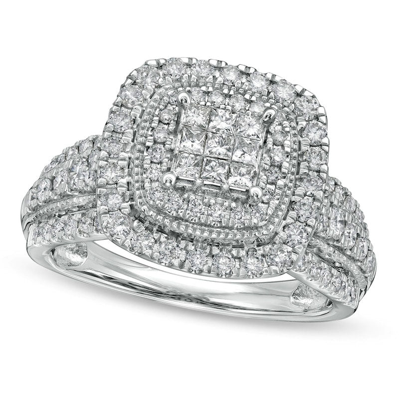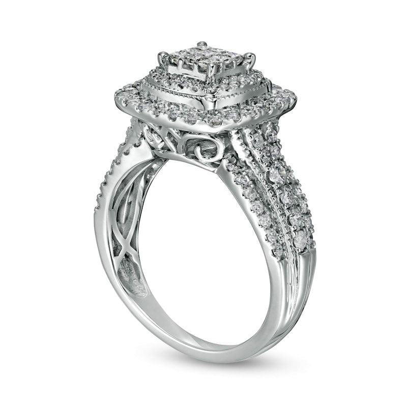 Indulge in vintage charm with this enchanting diamond engagement ring. Crafted in stylish 10K white gold, this ring is designed with a magnificent composite of princess-cut diamonds that sparkle brilliantly within a double cushion-shaped frame encrusted with diamonds and intricate milgrain detailing. The triple-row shank features a charming ribbon of graduated-sized diamonds that glisten between diamond-lined and milgrain borders. Boasting a total diamond weight of 1 ct. and a high-polish finish, this engagement ring is a stunning testament to your love and devotion.