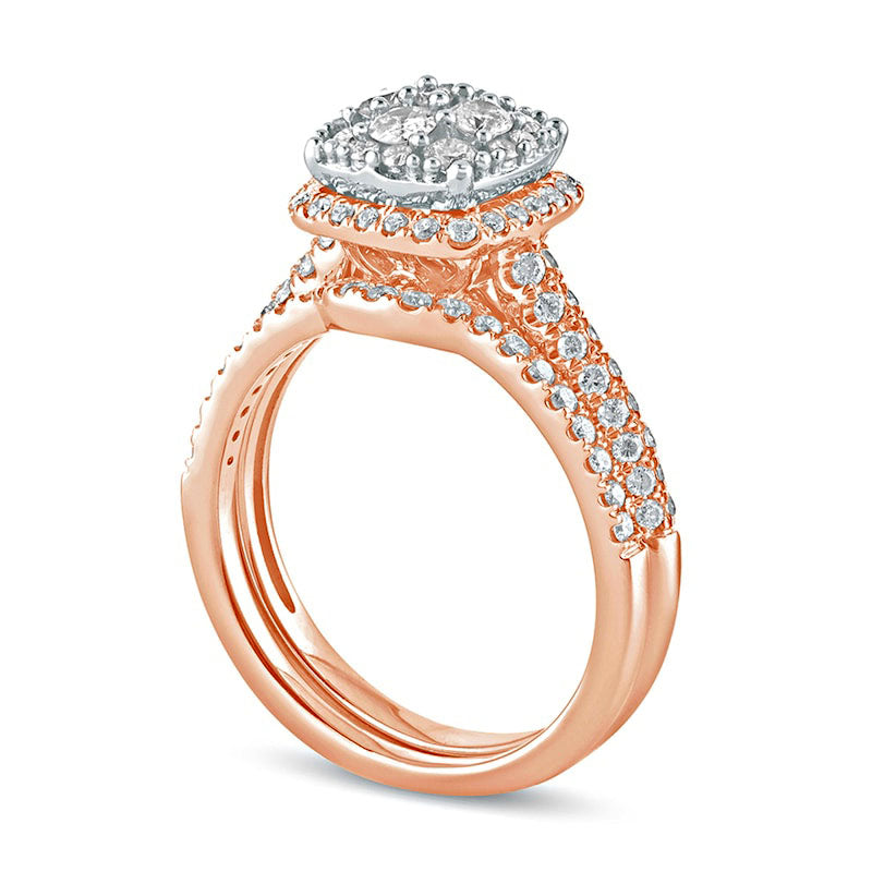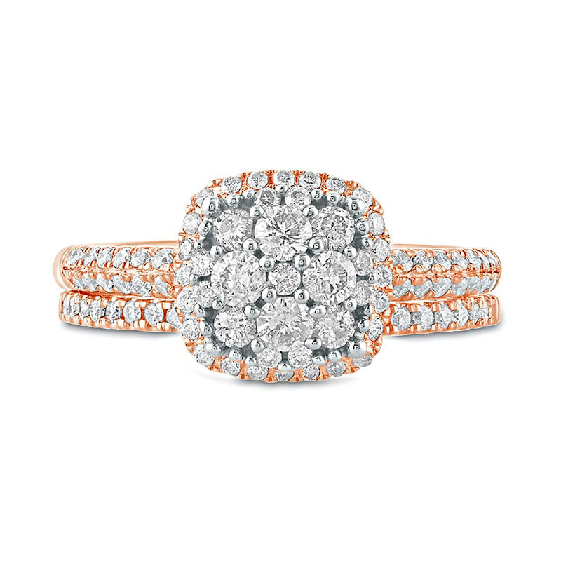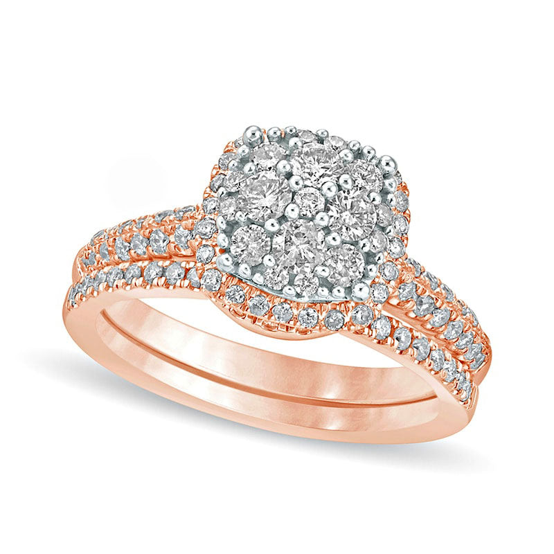 This beautiful diamond bridal set radiates love and romance. Crafted from precious 10K rose gold, the engagement ring showcases a stunning cushion-shaped diamond composite that shimmers with four 1/15 ct. diamonds. The central diamond is encircled by a halo of diamonds, with two rows of diamonds adorning the shank. The gallery beneath features bezel-set diamonds that accentuate the ring's intricate design. The coordinating wedding band is also adorned with sparkling diamonds, completing the set with a total diamond weight of 1 ct. This bridal set is sure to enchant and captivate, exuding elegance with its bright polished shine.