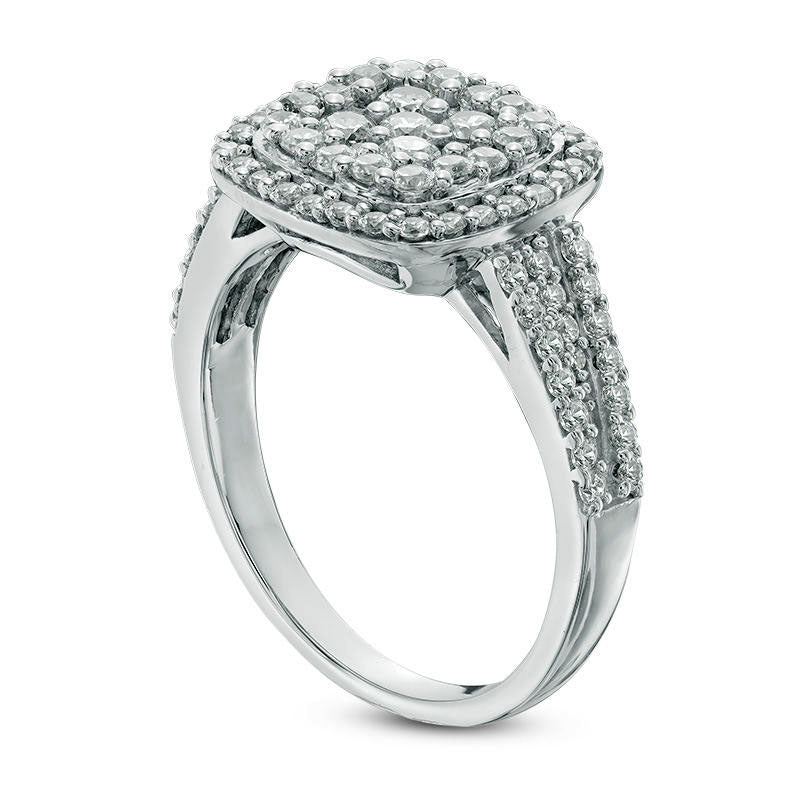 This stunning diamond engagement ring is the epitome of elegance and sophistication. Created in luxurious 10K white gold, the ring boasts a breathtaking cushion-shaped composite diamond at its center, surrounded by a dazzling border of shimmering diamonds. Adding to its allure, additional diamonds adorn the multi-row shank, completing the look of glamour and luxury. With a total weight of 1 ct. t.w. of diamonds and a polished shine, this ring is sure to captivate her heart and leave her breathless.