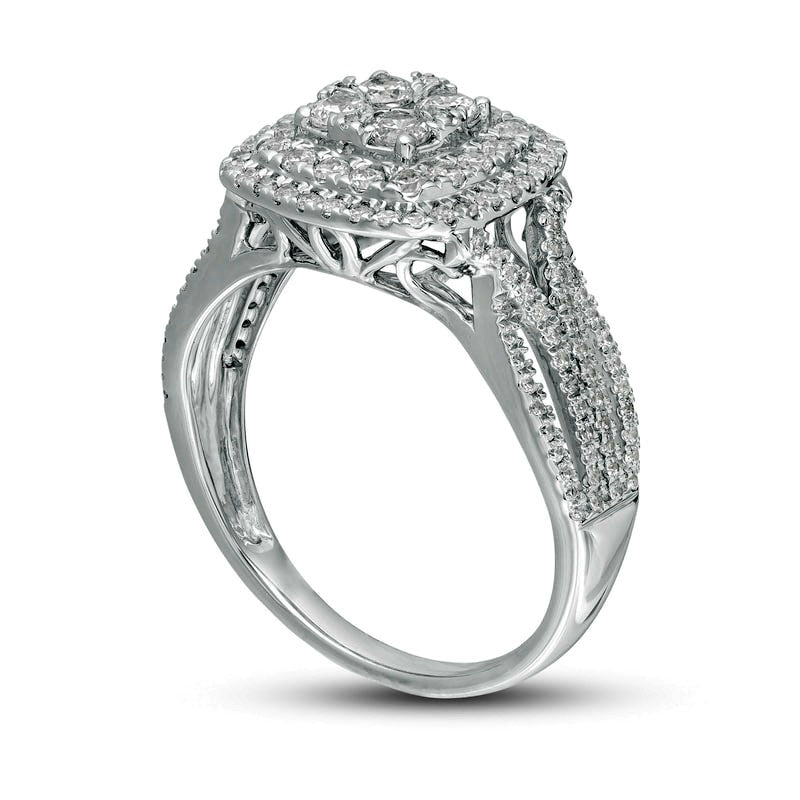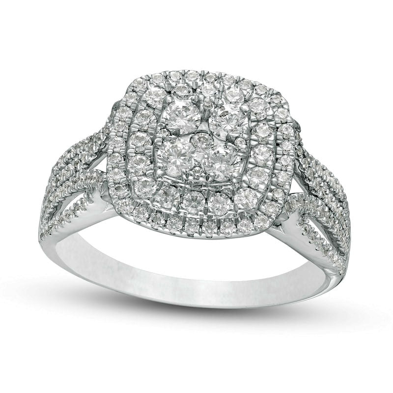 Present your love with an astounding diamond engagement ring that she'll cherish forever. Made of cool 10K white gold, this remarkable piece boasts a cushion-shaped composite of diamonds - the most significant four being 1/20 ct. each - enclosed in dual diamond frames. The inner diamond-lined ribbons of the split shank form "V" shapes surrounding the center, while exterior rows of diamonds add an attractive finish. With a total of 1 ct. t.w. of diamonds and a stunning polished shine, this engagement ring is a symbol of your everlasting love for her.