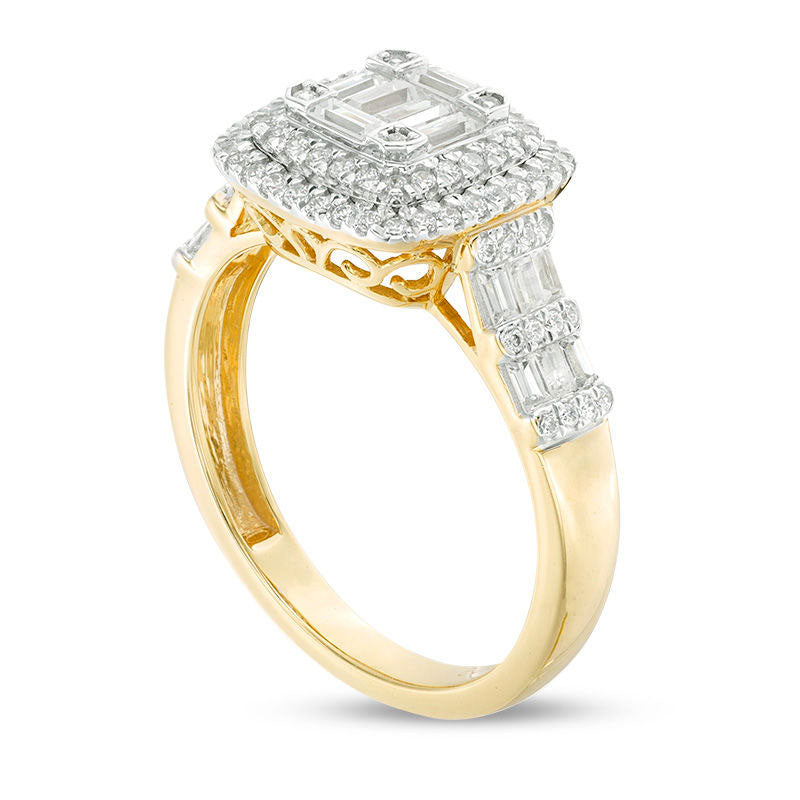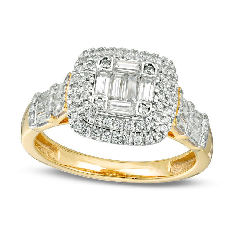 Celebrate your love with this stunning diamond engagement ring. Crafted in 10K gold, it features a unique cushion pattern of round and baguette-cut diamonds, surrounded by petite diamonds in two frames. The shank is adorned with collars of alternating round and baguette-cut diamonds. With 1 ct. t.w. of diamonds and a brilliant shine, this comfort-fit ring is a beautiful expression of your commitment.