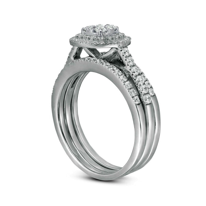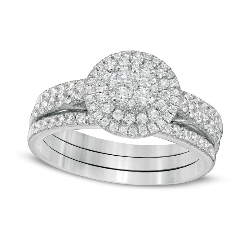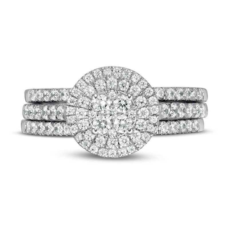Our stunning bridal set is the perfect way to honor all of your cherished memories. Its timeless beauty effortlessly complements your individual style, both now and forevermore. Crafted from sleek 10K white gold, the elegant engagement ring boasts a radiant composite diamond sitting between two glittering diamond frames, all set atop a band accentuated by even more dazzling diamonds. For your wedding day, a pair of diamond-lined bands complete the set, adding an extra touch of sparkle to your special moment. With a total of 1 ct. t.w. of diamonds and a polished shine that radiates for life, this bridal set is a true treasure.