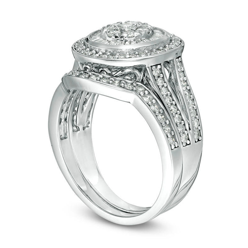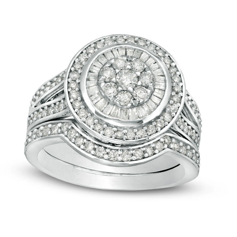 Celebrate love's magic with this exquisite diamond bridal set. Fashioned from 10K white gold, the engagement ring boasts a centerpiece of composite round diamonds anchored by a 1/20 ct. diamond and encircled by a scintillating diamond frame. The focal point is further emphasized by a second frame of sleek baguette-cut diamonds, a polished rim, and a perimeter of round diamonds. The split shank is adorned with more dazzling diamonds. On your big day, the matching contoured wedding band adds the finishing touch. With a total of 1 ct. t.w. of diamonds and a radiant sheen, this bridal set is the embodiment of affection.