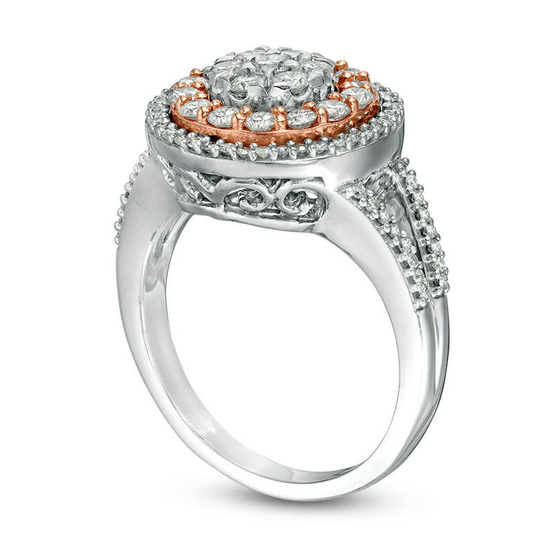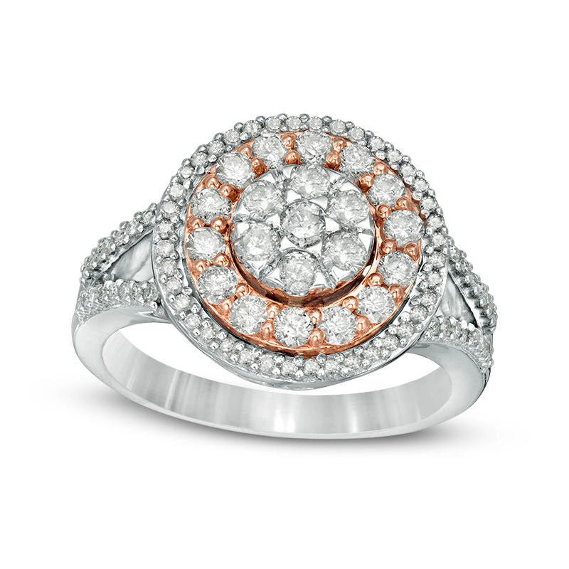 Get ready to commemorate the love of your life with this stunning engagement ring adorned with sparkling diamonds. Made from 10K two-toned gold, this striking piece of jewelry showcases a gorgeous arrangement of diamonds that form a flower shape around the center, containing a 1/20 ct. diamond in white gold. The center is further enhanced by a halo frame of diamonds in rose gold, surrounded by another halo in white gold to create an exquisite display. The split shank has petite diamonds that add an extra layer of charm to this elaborate piece. With a total carat weight of 1 ct. t.w. and a dazzling shine, this engagement ring is sure to be the perfect expression of your love and commitment.