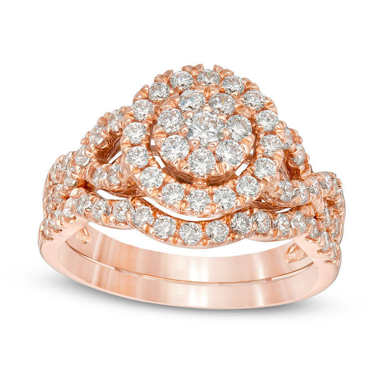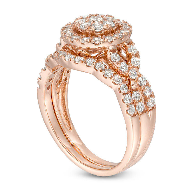 Delight your beloved with this stunning diamond bridal set that perfectly reflects her refined taste. Created with exquisite 10K rose gold, the engagement ring boasts a captivating 1/15 ct. diamond placed at the center of a diamond composite - embraced by a halo frame made of diamonds. The twist split shank, adorned with sparkling diamonds, brilliantly complements the matching scallop-edged diamond wedding band. Embellished with 1 ct. t.w. of diamonds and polished to a dazzling luster, this timeless bridal set is the realization of her fondest desires.