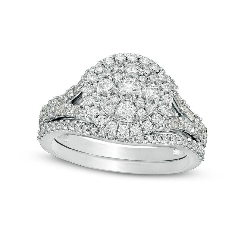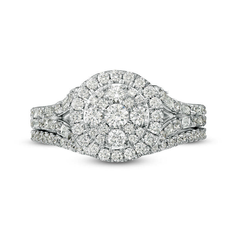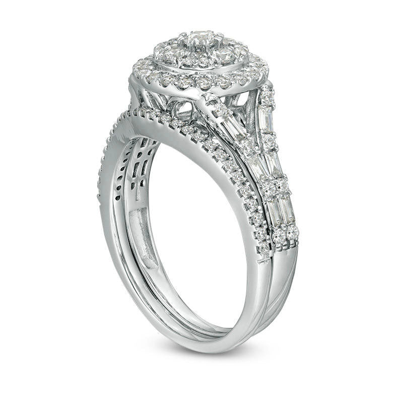 Select this extraordinary and sentimental 1 CT. T.W. Composite Diamond Frame Bridal Set in 10K White Gold as the beginning of your beautiful forever. The engagement ring is crafted with precision and elegance, featuring a central diamond weighing 1/10 ct. enveloped in stepped diamond frames that reflect the luxuriousness of 10K white gold. The deep split shank is embellished with a mixture of round and baguette-cut diamonds that alternate to create a sophisticated aesthetic. On your special day, the wedding band with its contoured design complements the engagement ring flawlessly, spreading the romance and glamour of diamonds all over. The bridal set boasts of a total diamond weight of 1 ct. t.w. with a sparkling buffed luster that will leave everyone in awe. Choose this incredible and captivating bridal set that will stun you with its sheer beauty and glamorous design.