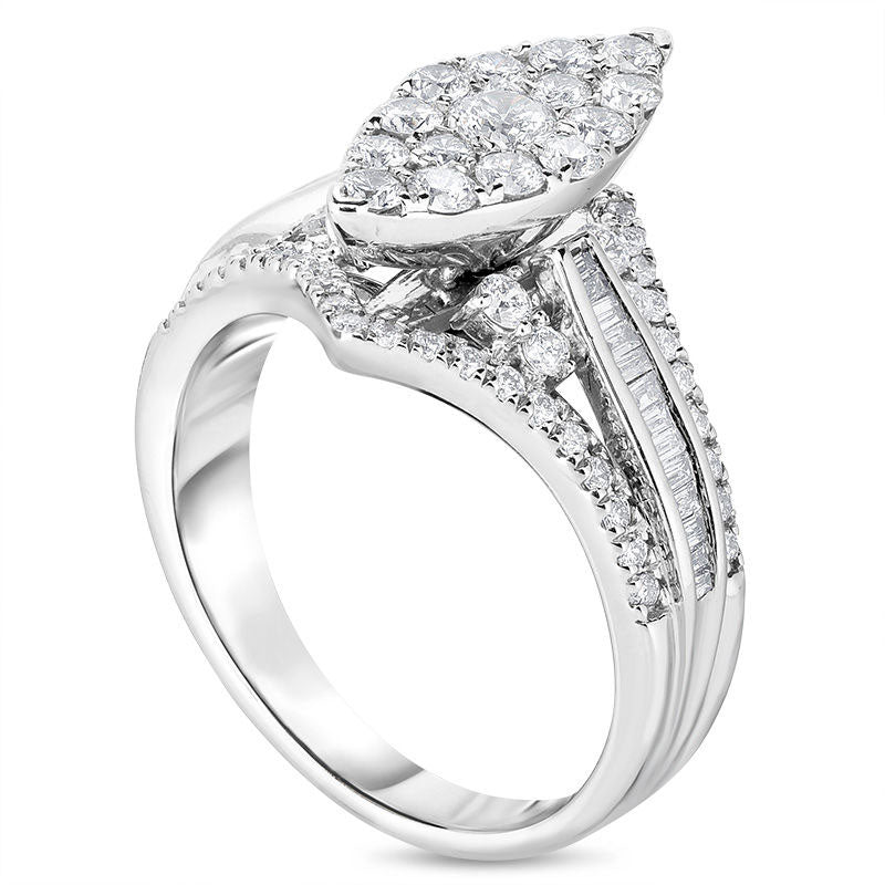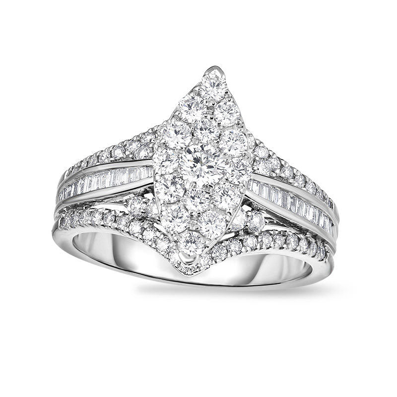 Celebrate your love with this exquisite diamond engagement ring. A stunning 1/10 ct. round diamond sits at the center of a beautifully crafted marquise-shaped diamond composite, all set in gleaming 14K white gold. Pairs of diamonds elegantly flank the marquise and top and bottom the pinched baguette-cut diamond ribbon that embellishes the shank. Completing the design, are two rows of chevron-shaped round diamonds in a split shank. With a total of 1 ct. t.w. of diamonds and a brilliant shine, this engagement ring is a true testament to your devotion.