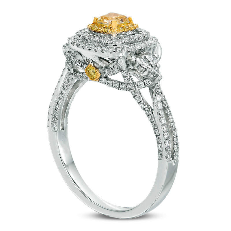 This stunning engagement ring is the perfect symbol of enduring love. Crafted from 14K white gold, it features a dazzling 1/3 ct. cushion-cut yellow diamond at its center, encircled by a frame of round yellow diamonds and yellow gold. Two halo frames of white diamonds follow, accompanied by diamond trios and a diamond twisting split shank, all gleaming with a bright polished finish. With a total diamond weight of 1 ct., this ring is sure to enchant and delight. Available in size 7.