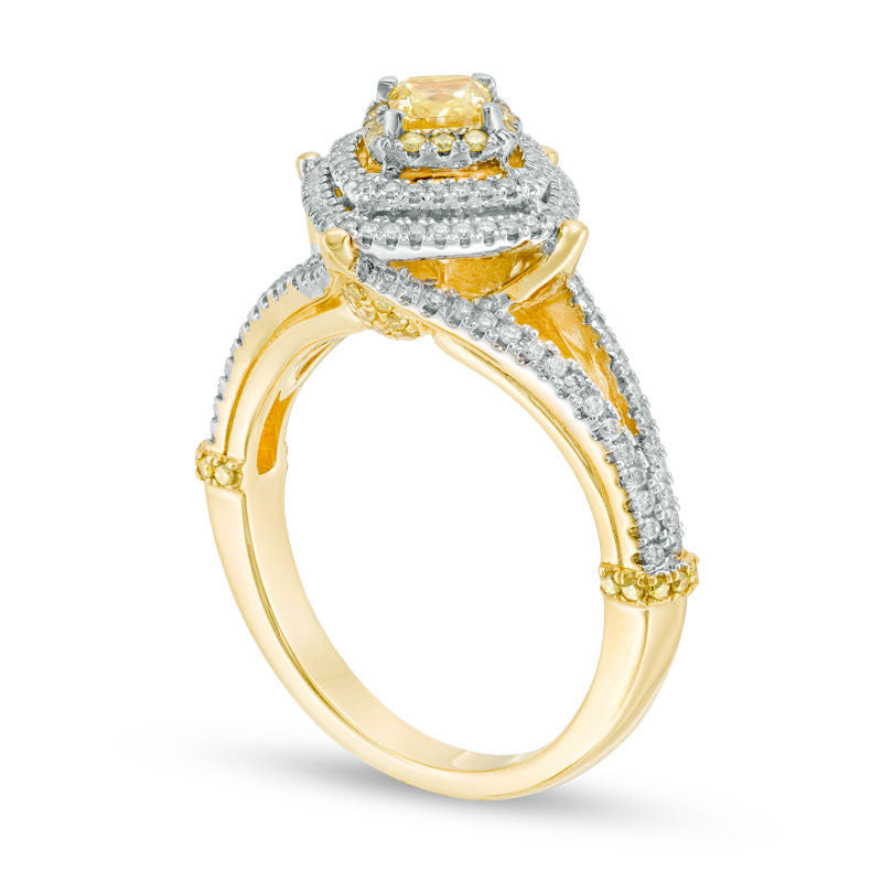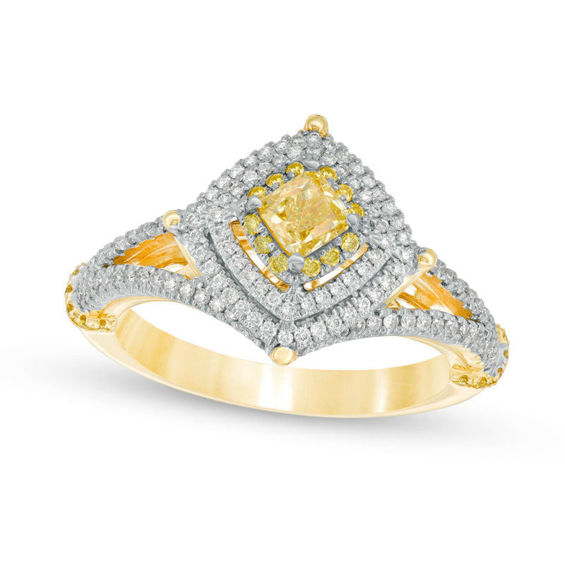 1.0 CT. T.W. Cushion-Cut Yellow and White Natural Diamond Triple Tilted Frame Engagement Ring in Solid 14K Gold - Size 7