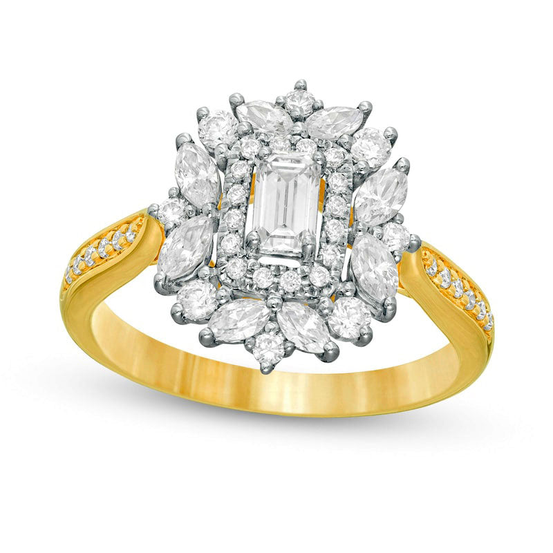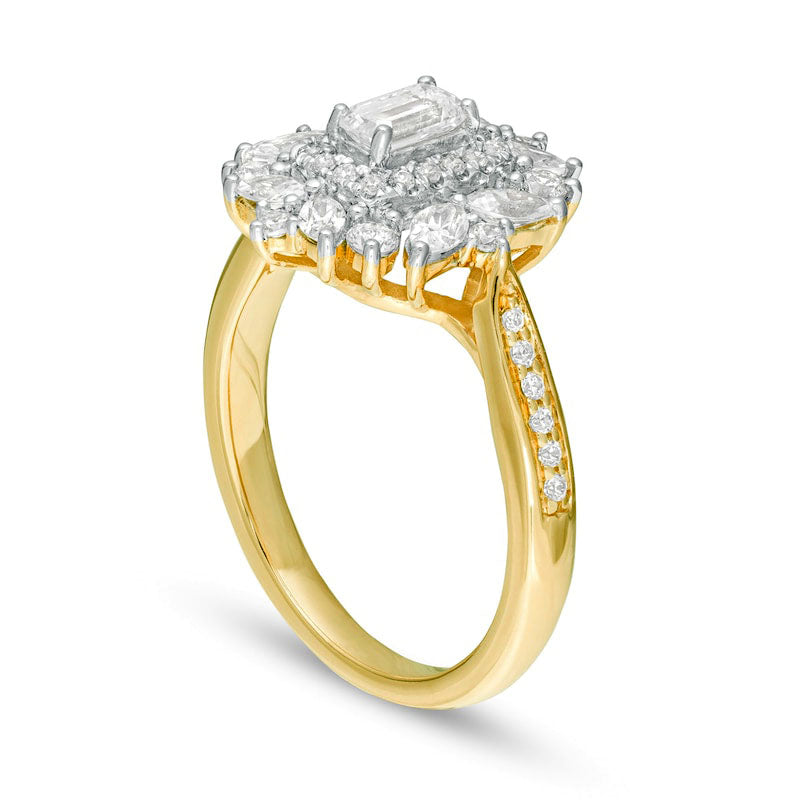 1.0 CT. T. W. Emerald-Cut Natural Diamond Flower Frame Engagement Ring in Solid 14K Gold
