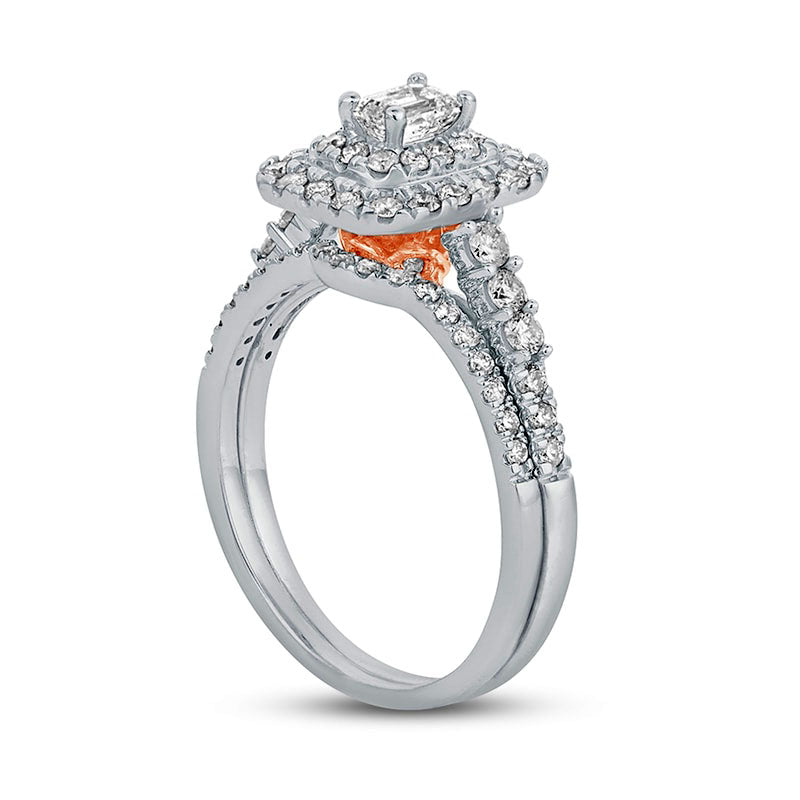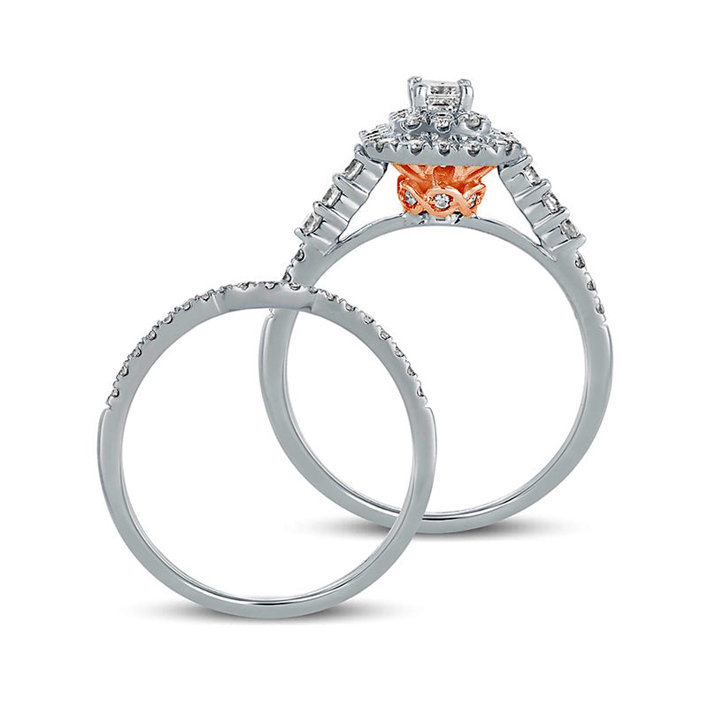 Indulge in the magic of love with this breathtaking diamond bridal set. Expertly crafted in lustrous 10K white gold, the engagement ring boasts a stunning 1/3 ct. emerald-cut diamond resting within a double diamond-lined frame. The shank is adorned with graduated-sized diamonds that shimmer radiantly. A hidden 10K rose gold crown detail, encrusted with diamonds, adds to the charm of this captivating ring. On your big day, the graceful and contoured diamond-lined wedding band seals your commitment. With an incredible total weight of 1 ct. t.w. of diamonds and a brilliant polished shine, this bridal set perfectly commemorates the beauty and wonder of your everlasting love.