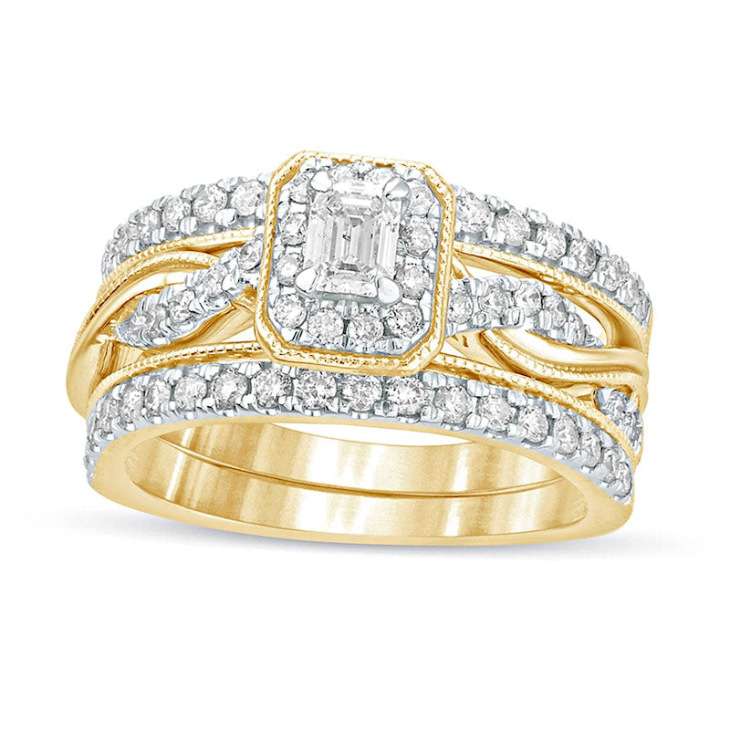 This beautiful vintage-style diamond bridal set is the perfect symbol of your timeless love. Crafted in luxurious 14K gold, the engagement ring features a breathtaking 1/3 ct. emerald-cut diamond set in a sparkling frame of diamonds and delicately detailed with milgrain. The shank boasts two ribbons, adorned with diamonds and milgrain, elegantly twisted together to create a captivating effect. The enhancer completes the set with its double-row of dazzling diamonds and intricate milgrain detailing. Radiating with a total weight of 1 ct. of diamonds, this bridal set truly sparkles and shines. Showcasing a brilliant buffed luster, this diamond bridal set is an irresistible choice for your beloved.