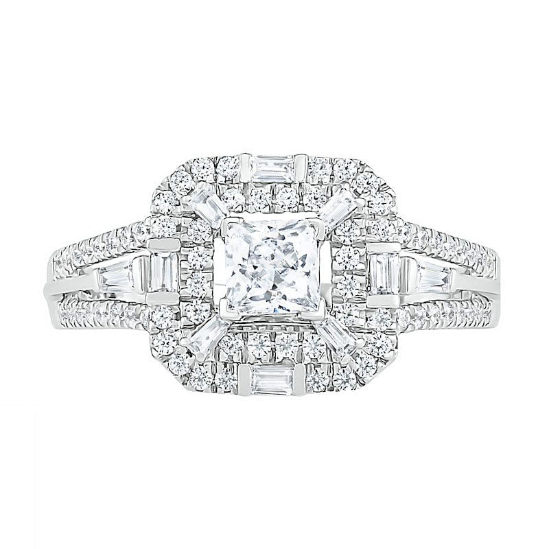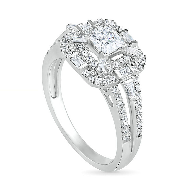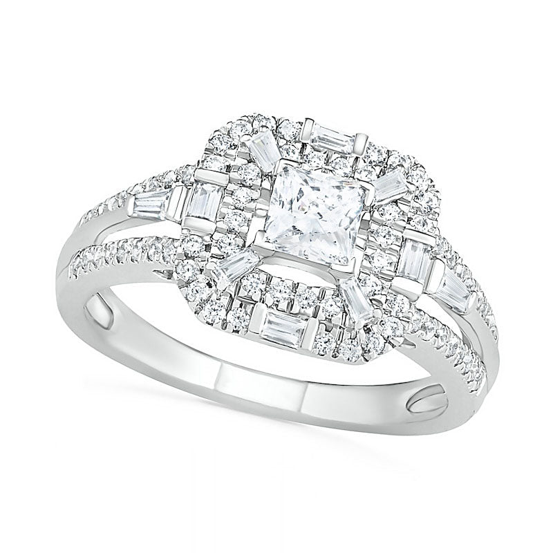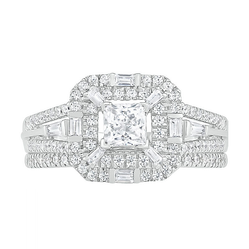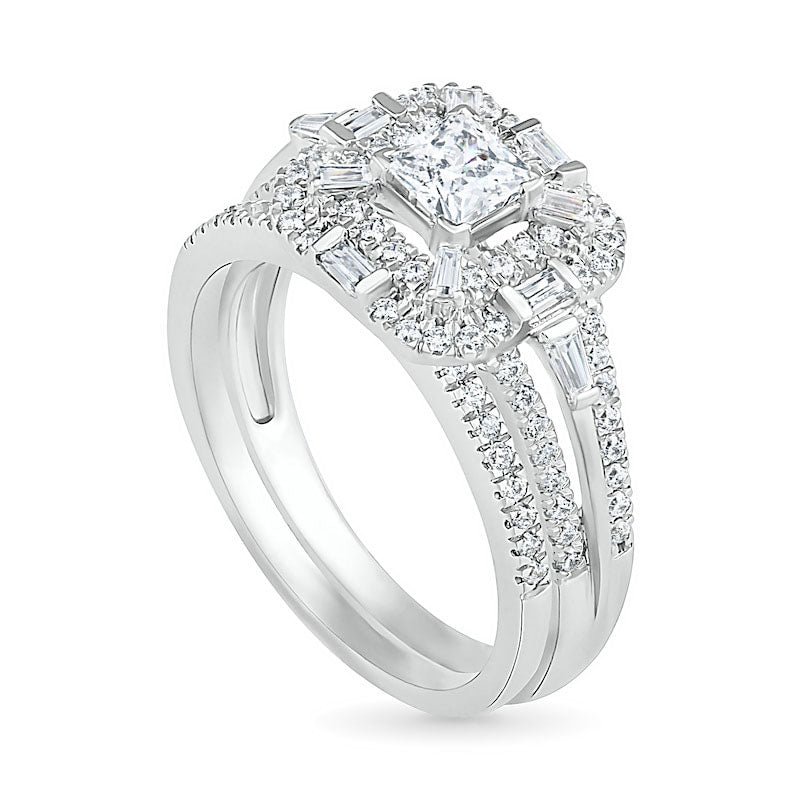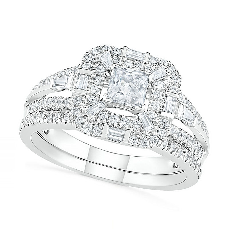 Experience the ultimate expression of love with this exquisite diamond bridal set. Crafted from dazzling 10K white gold, the engagement ring boasts an impressive 1/3 ct. princess-cut diamond. The double octagonal frame adds depth and dimension to the design, with shimmering round and baguette-cut diamonds that catch the light from every angle. The split multi-row shank is adorned with channel-set baguette-cut diamonds that further enhance the beauty of the polished center, surrounded by diamond-lined borders. Complete your commitment with the matching diamond wedding band, perfectly coordinating with the engagement ring. With a total weight of 1 ct. t.w. of brilliant diamonds and a radiant polished finish, this bridal set is a dream come true for your beloved.