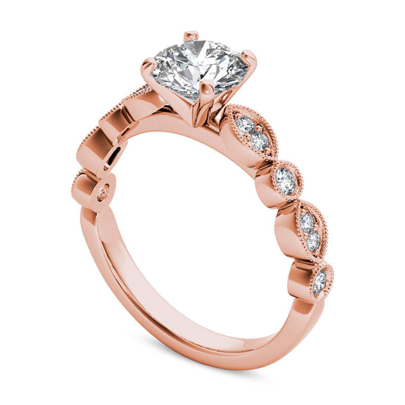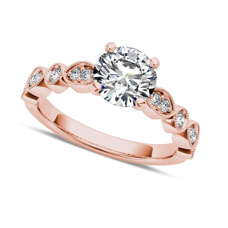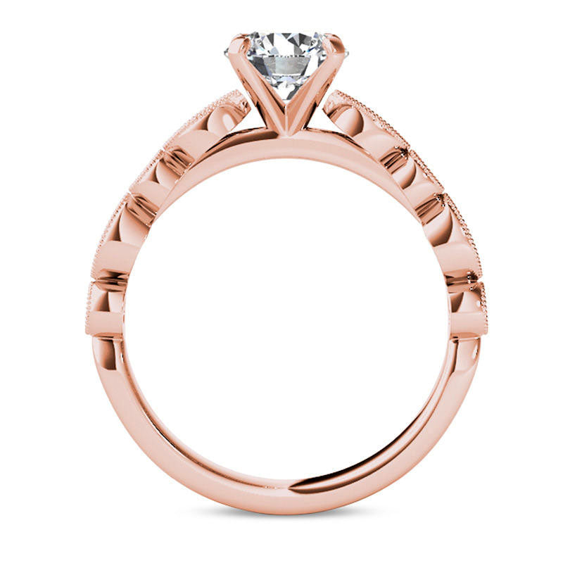 Crafted in 14K rose gold, this vintage-style engagement ring boasts a brilliant 1 ct. t.w. diamond. A stunning 3/4 ct. diamond center stone takes center stage, making this a piece that will be treasured for a lifetime.