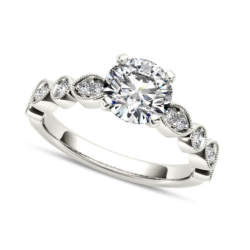 The 14K white gold vintage-style engagement ring boasts a striking 1 ct. t.w. of shimmering diamonds, with a stunning 3/4 ct. diamond at its center.