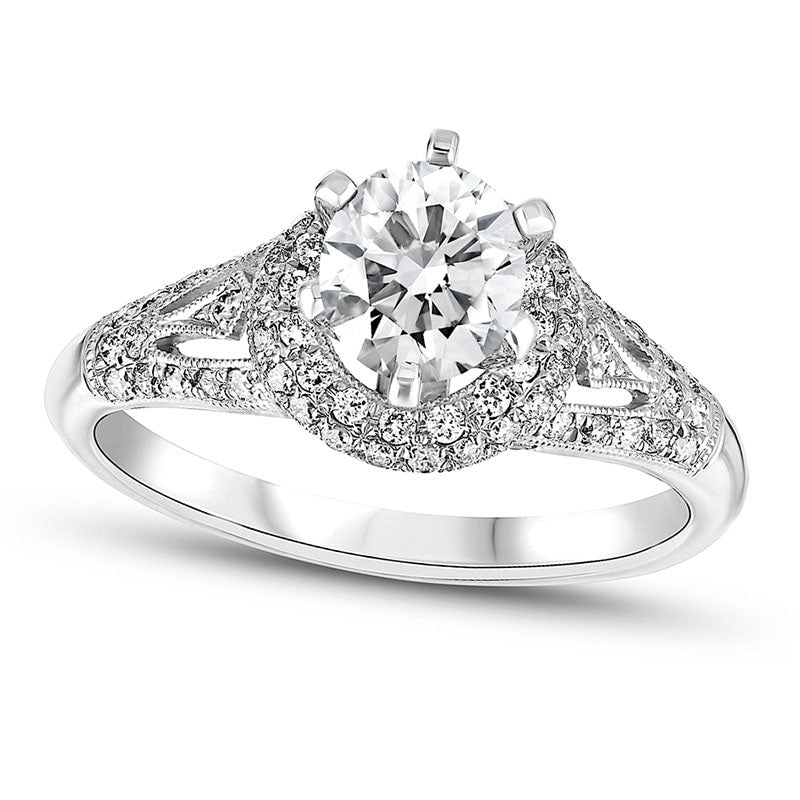 Capture her heart with a symbol of your love that's just as stunning as she is. Present her with this 1 CT. T.W. Diamond Vintage-Style Split Shank Engagement Ring in 14K White Gold on that special day. The ring boasts a 3/4 round diamond center stone that's impossible to miss. Smaller accent diamonds form a delightful double frame around the central stone, while further diamonds line the intricate open worked shank. Vintage elegance comes through with exquisite milgrain detailing, completing the magnificent design. This beautiful ring contains a total of 1 ct. t.w. of diamonds and shines brilliantly, guaranteeing a look she will cherish forever.