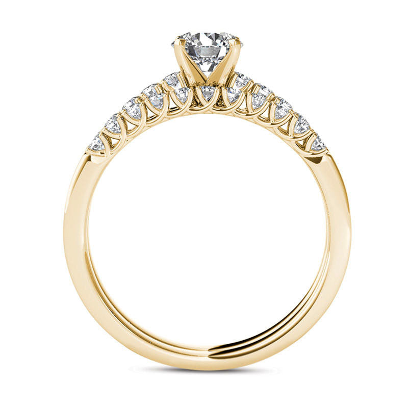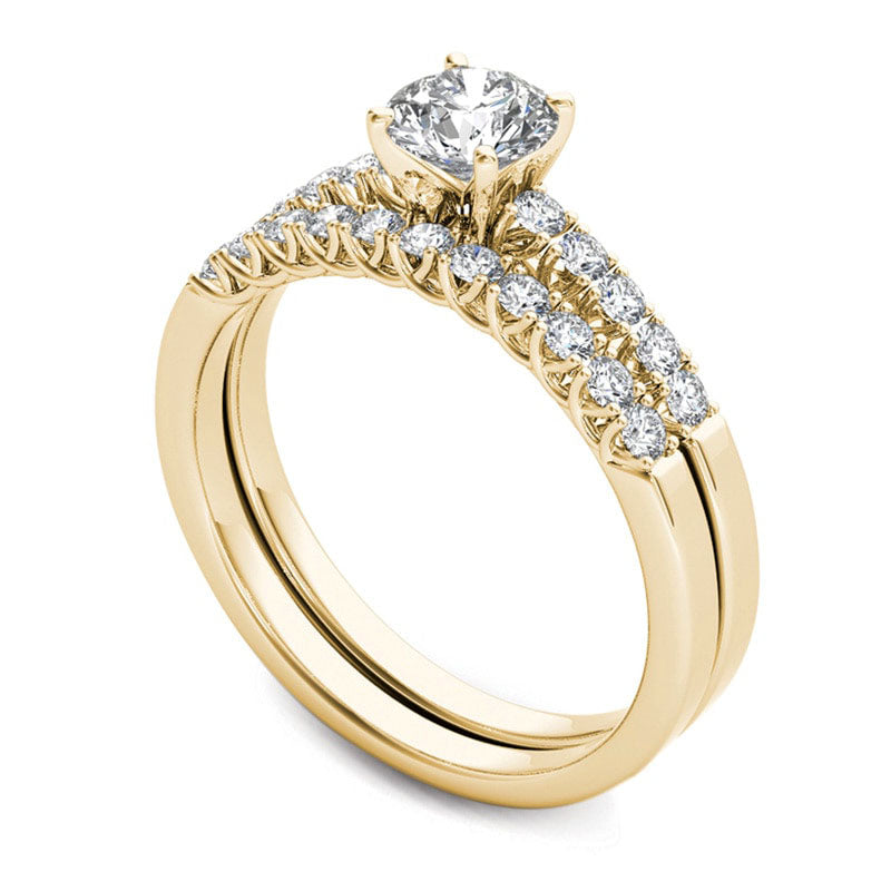 The 1 CT. T.W. Diamond Bridal Set in 14K Gold is a timeless and sophisticated design that any bride-to-be will adore. Fashioned from luxurious 14K gold, the engagement ring boasts a central 1/2 ct. round diamond perched in a four-prong setting. The slender shank of the ring is also adorned with smaller round accent diamonds for added sparkle. The set comes complete with a coordinating diamond wedding band that perfectly complements the stunning engagement ring. With a total of 1 ct. t.w. of diamonds and a high-polish finish, this bridal set is a true masterpiece meant to endure a lifetime of love and memories.