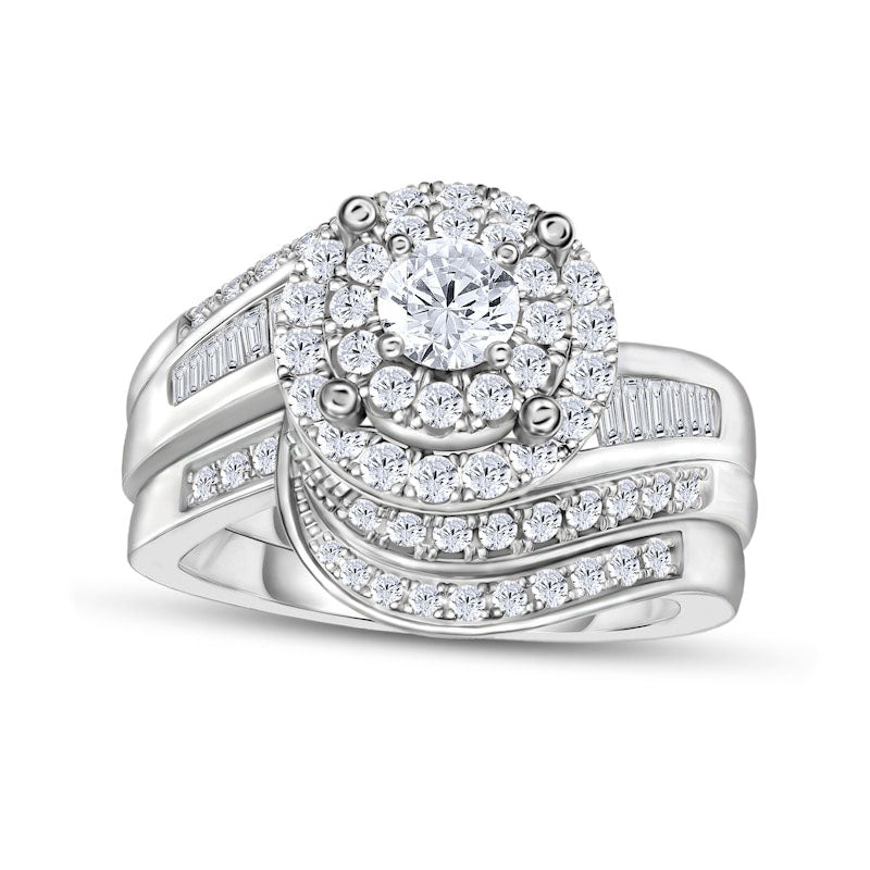 Show your beloved how much you care with this stunning diamond bridal set. Crafted in 14K white gold, the captivating engagement ring features a 1/4 ct. diamond embraced by a duo of diamond frames. The center design is further accentuated by diamond-encrusted bypassing ribbons, while the double-row shank is embellished with channel-set baguette-cut diamonds. The matching curved wedding band complements the engagement ring with a shimmering diamond-adorned ribbon and a side row of diamonds. With a total of 1 ct. t.w. diamonds and a brilliant finish, this bridal set is the perfect way to symbolize your love and commitment.