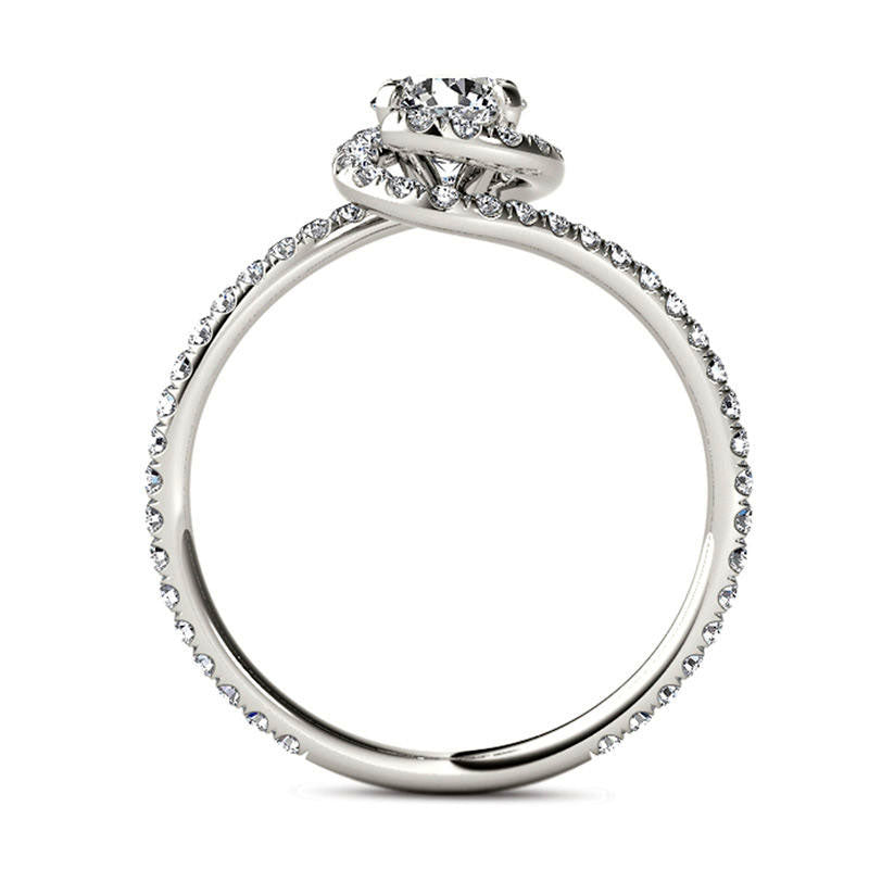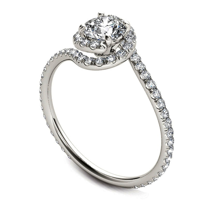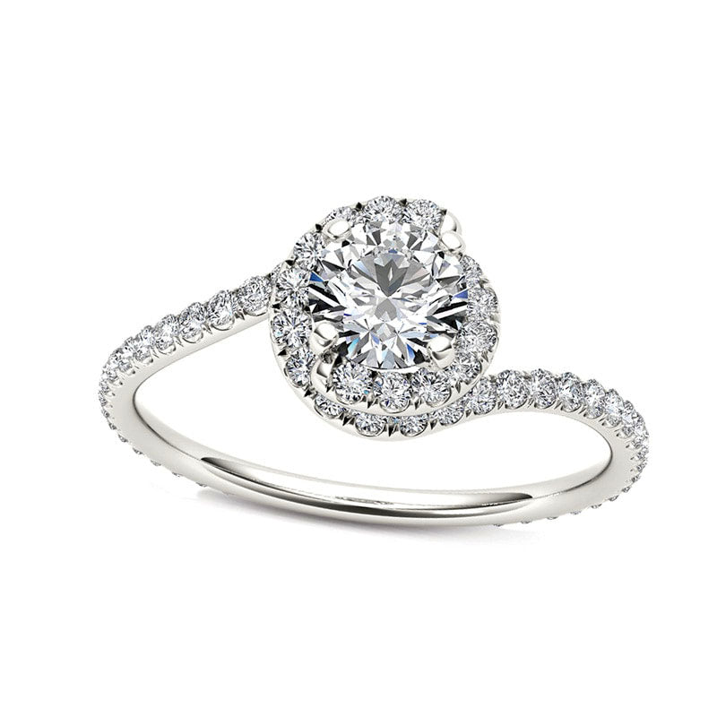 If you're searching for a ring that represents your undying love and devotion, look no further than this exquisite diamond engagement ring. Expertly crafted with 14K white gold, this stunning piece showcases a brilliant 1/2 ct. round-cut diamond at the center of the design. Surrounded by a swirling frame adorned with smaller round accent diamonds, this ring is perfectly shaped to fit snugly and elegantly on your finger. The bypassing shank adds a touch of grace and femininity to this already breathtaking piece, which boasts a total of 1 ct. t.w. diamonds and a polished shine. This engagement ring is ideal for anyone who values exceptional craftsmanship, attention to detail and a refined, luxurious aesthetic. Surprise your partner with this captivating ring and watch as her eyes light up with joy and excitement.
