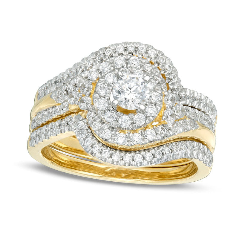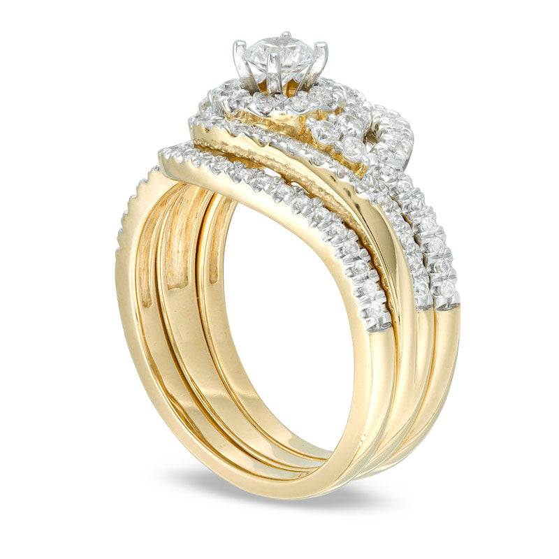 Celebrate your eternal love with this exquisite diamond bridal set. Meticulously crafted in 14K gold, the engagement ring features a 1/4 ct. diamond that dazzles within a glistening diamond frame. The breathtakingly beautiful diamond-studded bypass shank adds a touch of sophistication to the ring. The set also includes two matching contoured diamond bands that perfectly complement the engagement ring. In total, this three-ring bridal set boasts a brilliant 1 ct. t.w. of diamonds, making it a stunning statement of your everlasting romance. With its impeccable craftsmanship and radiant shine, this bridal set is a true testament to your love story.