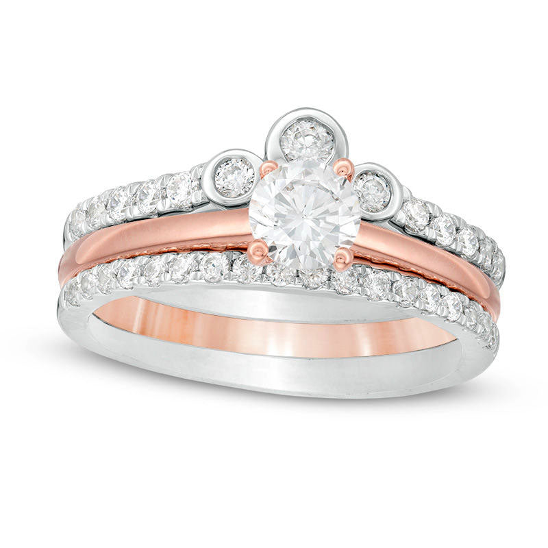 Celebrate the love you share with your special someone by gifting them this stunning diamond bridal set. Crafted in 14K two-toned gold, the rose engagement ring boasts a sparkling 1/2 ct. diamond solitaire that will take her breath away. On your wedding day, the dazzling white gold and diamond enhancer adds a touch of royalty with its ribbon of diamonds on one side and trio of bezel-set diamonds atop a diamond band on the other. This enchanting bridal set features 1 ct. t.w. of diamonds, ensuring it will sparkle for a lifetime. Give her the gift of a lifetime with this crown bridal set, as it serves as a timeless reminder of your unwavering love.