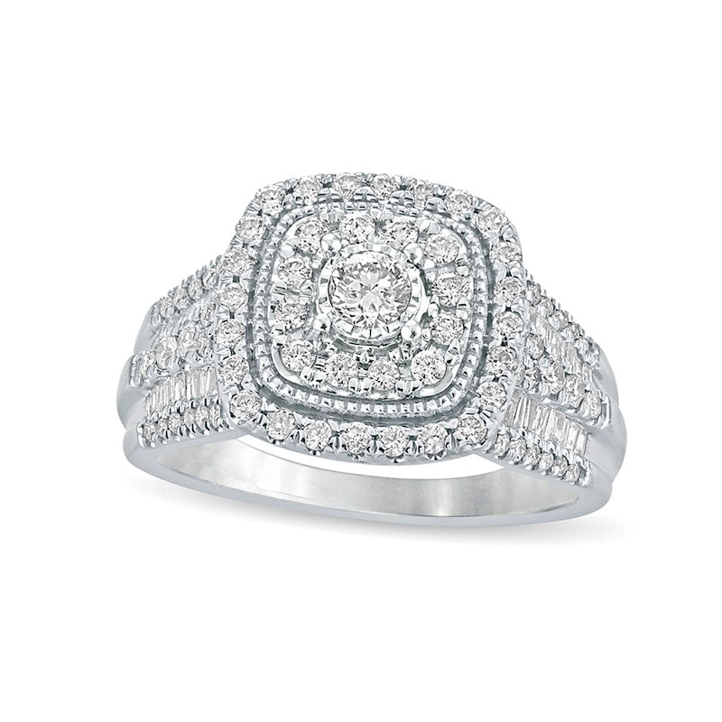 This vintage-style diamond engagement ring is sure to make a statement. Crafted in 10K white gold, the captivating design boasts a 1/6 ct. diamond placed to maximize its brilliance, encased in a double cushion-shaped diamond frame with delicate milgrain detailing. The multi-row shank features rows of round diamonds and channel-set baguette-cut diamonds, totaling a remarkable 1 ct. t.w. With its stunning sparkle and intricate design, this ring is the perfect start to a lifetime of love.