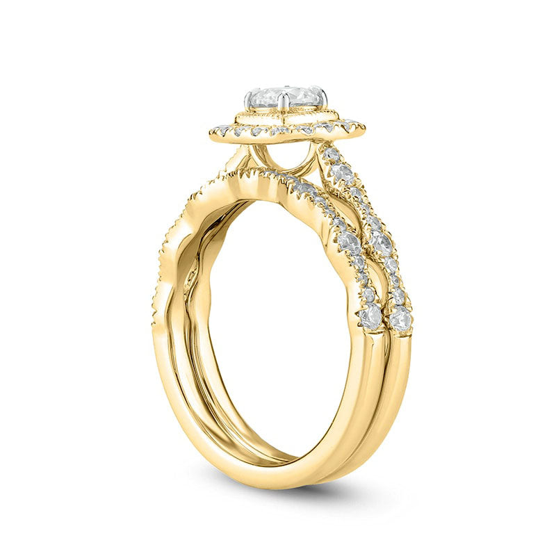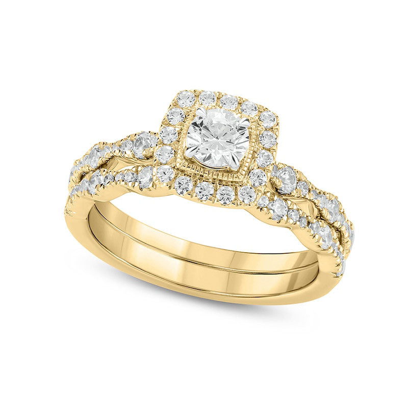 Celebrate your love with this elegant vintage-style diamond bridal set. Crafted from luxurious 10K gold, the engagement ring features a stunning 1/3 ct. round diamond at its center, surrounded by a cushion-shaped frame of diamonds and intricate milgrain detailing for a truly timeless look. The band is adorned with multi-sized diamonds arranged in a scalloped Art Deco pattern, also highlighted with intricate milgrain. The coordinating wedding band sparkles with even more diamonds. With a total weight of 1 ct. t.w. and a gorgeous, polished finish, this bridal set is the perfect symbol of your everlasting bond.