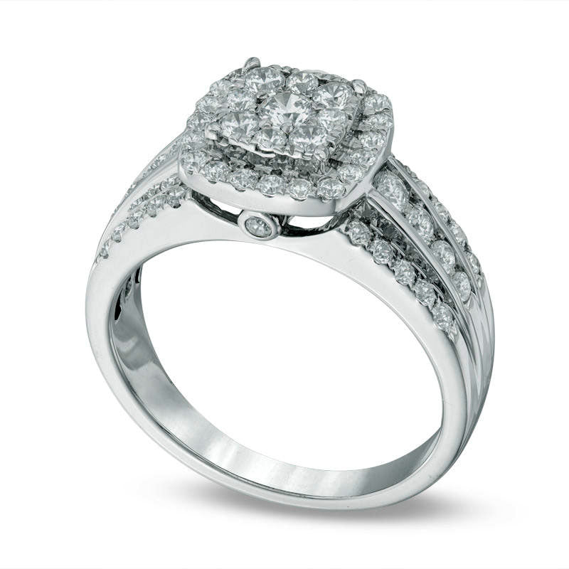 Make the moment unforgettable with this exquisite diamond engagement ring. Beautifully crafted in sleek 10K white gold, this dazzling piece boasts a stunning cushion-shaped cluster of shimmering round diamonds at its core, with smaller accent diamonds forming a glittering frame around the center setting, creating an unforgettable sparkle. The ring's shank is also adorned with additional diamonds for an extra touch of glamour, and two bezel-set diamonds on each side complete the look. With a total diamond weight of 1 ct. t.w., this engagement ring is designed for comfort and is polished to a brilliant shine that will make her heart skip a beat.