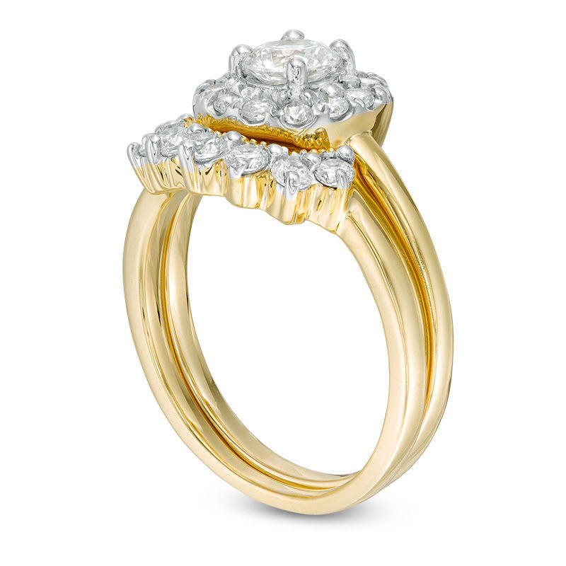 This stunning vintage-style diamond bridal set is the perfect symbol of your enduring love. The engagement ring, crafted from warm 10K gold, features a sparkling 1/2 ct. diamond wrapped in a cushion-shaped frame of smaller diamonds. The coordinating contoured wedding band is adorned with seven starburst diamonds and intricate milgrain detail. Together, these rings boast 1 ct. t.w. of diamonds and a bright polished shine, making them a truly romantic and sentimental choice for your special day. Celebrate your love with this timeless and unforgettable bridal set.