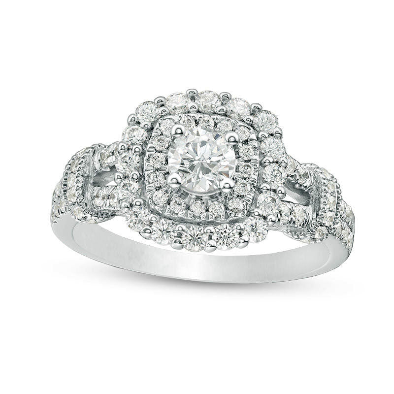 Experience elegance and style with this breathtaking vintage-inspired engagement ring. Meticulously crafted in 14K white gold, it features a stunning 1/3 ct. diamond at the center, delicately wrapped in two cushion-shaped frames adorned with shimmering diamonds. The enchanting split shank also sparkles with diamonds, while diamond-lined collars with intricate milgrain borders add a touch of heirloom charm. Boasting a total weight of 1 ct. t.w. of diamonds and a brilliant buffed luster, this timeless piece is the perfect embodiment of your enduring love.