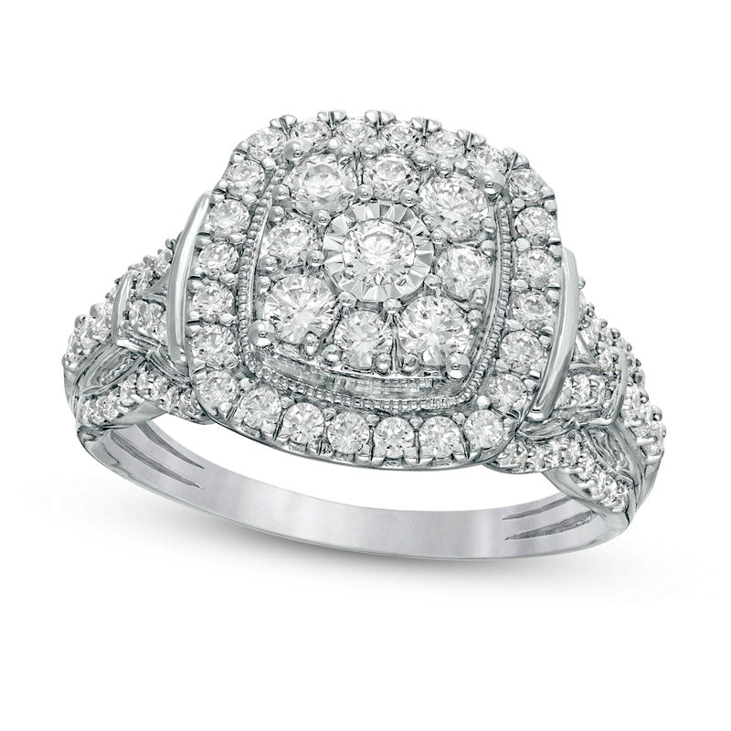 Elevate your proposal with the breathtaking beauty of this vintage-inspired diamond engagement ring. Crafted in sleek 10K white gold, this piece features a stunning 1/20 ct. center diamond, meticulously positioned to maximize its size and radiance. The center stone is surrounded by two elegant, cushion-shaped diamond frames and an intricate milgrain border, adding to the ring's ornate design. The split shank features a multi-row diamond-studded design, accented with polished collars for added shine. With a total weight of 1 ct. and a dazzling, polished finish, this engagement ring is the ultimate symbol of your love and commitment.