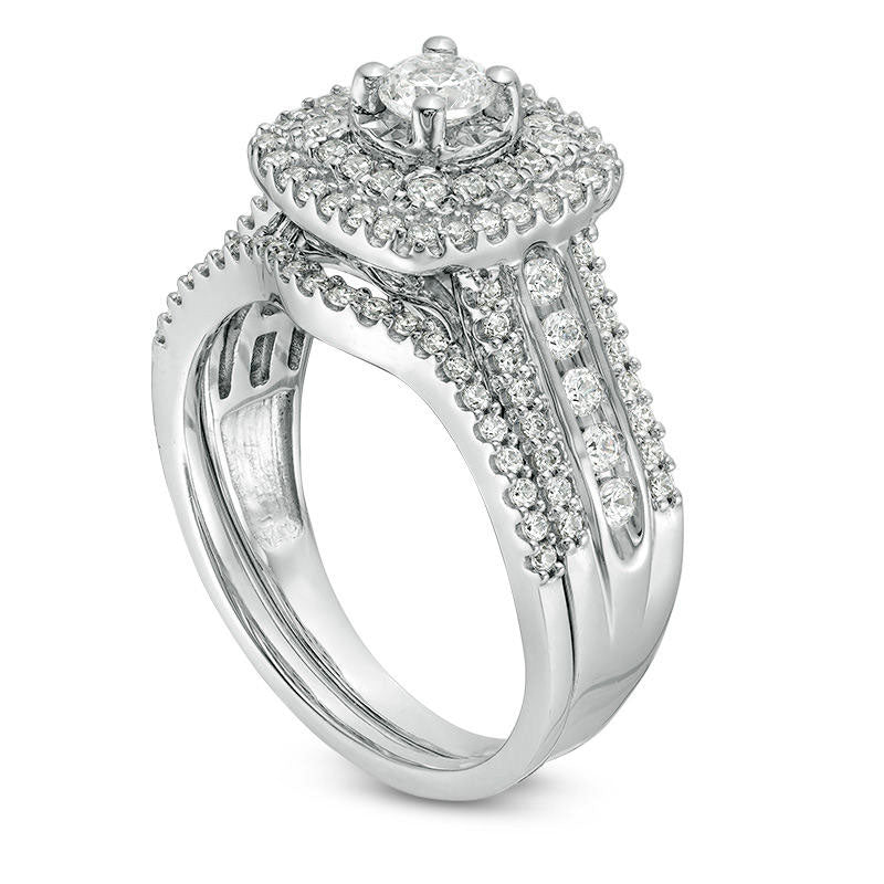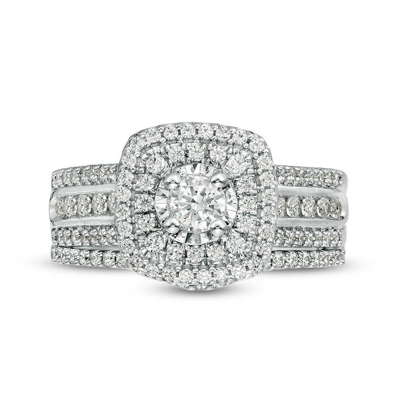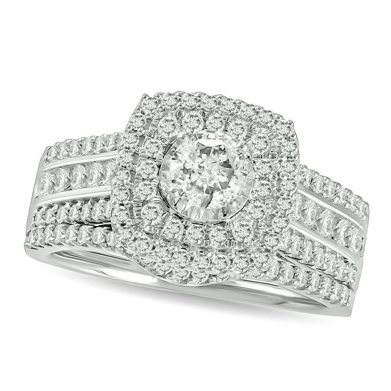 1.0 CT. T.W. Natural Diamond Double Cushion Frame Multi-Row Bridal Engagement Ring Set in Solid 10K White Gold
