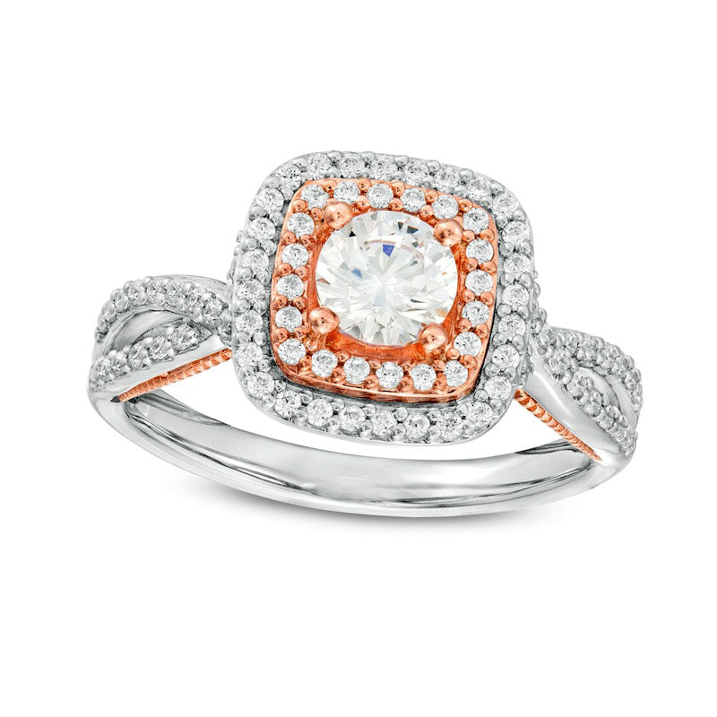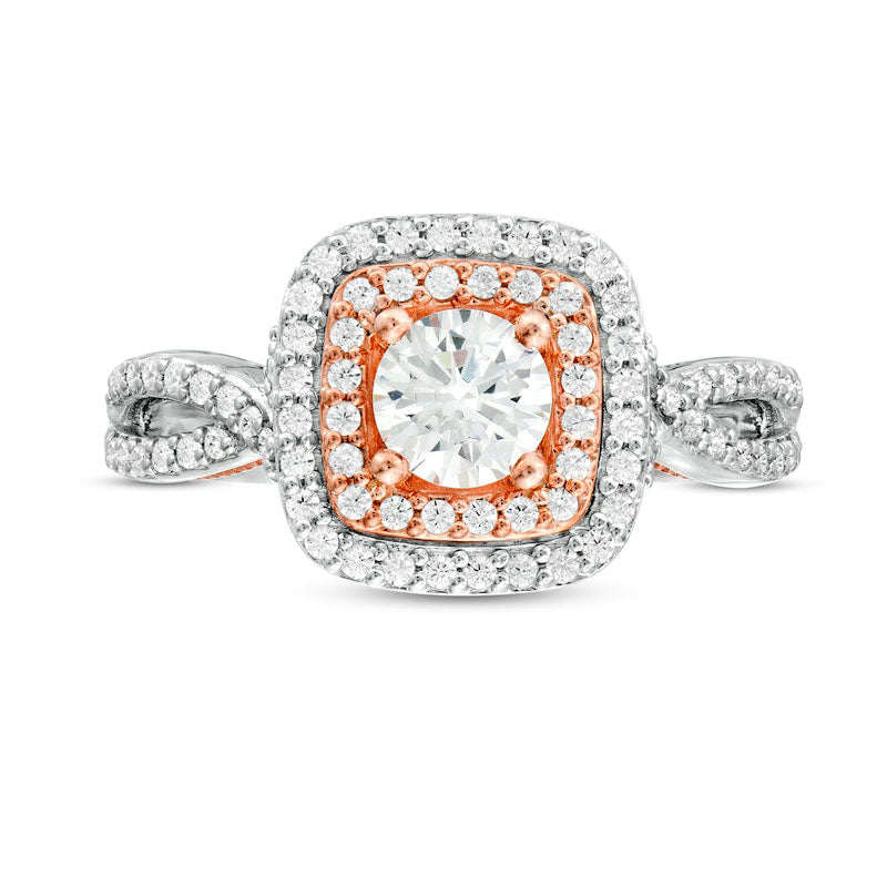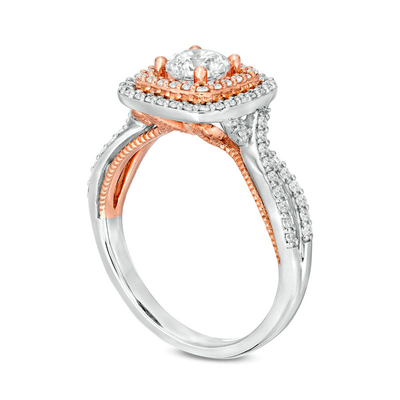 Reminiscent of her most cherished dreams, this diamond engagement ring will forever symbolize your love and devotion. Expertly crafted in 14K two-tone gold, this exquisite piece boasts a stunning 5/8 ct. diamond surrounded by a double cushion-shaped frame in white and rose gold, all adorned with breathtaking smaller diamonds. The ring's split shank is also adorned with diamonds, adding to its captivating sparkle. With a total weight of 1 ct. t.w. of diamonds and a brilliant polished finish, this engagement ring will forever stand as a testament to your heartfelt pledge of love.