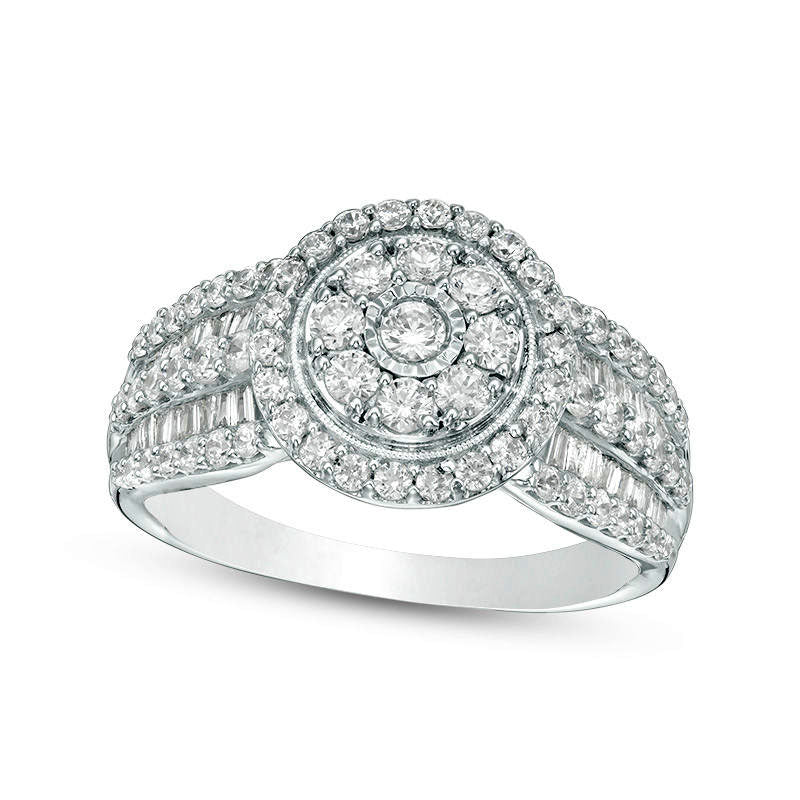 Capture the heart of your beloved with this breathtaking vintage-style diamond engagement ring. Expertly crafted in 10K white gold, this captivating piece boasts a striking design featuring an artfully set single diamond, surrounded by a frame of glittering diamonds and intricate milgrain detailing, then bordered by another layer of dazzling diamonds. The shimmering five-row shank alternates with ribbons of round and baguette-cut diamonds, creating a stunning display. With an impressive total of 1 ct. t.w. of diamonds and a magnificent polished finish, this heirloom-quality engagement ring is sure to delight your beloved for years to come.