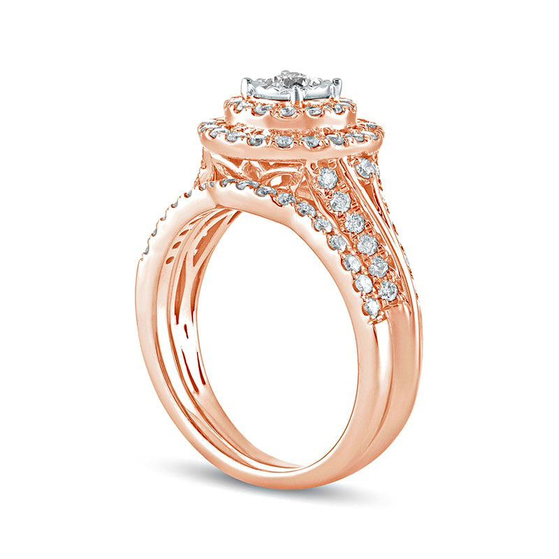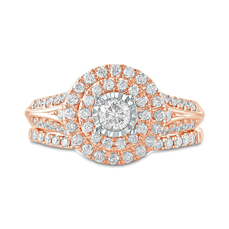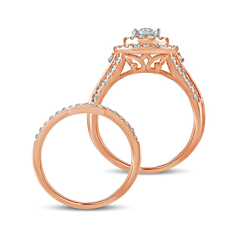 1.0 CT. T.W. Natural Diamond Double Frame Bridal Engagement Ring Set in Solid 10K Rose Gold