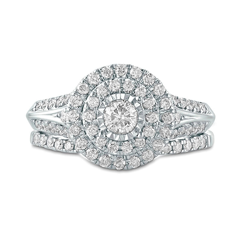 Make your love shine brightly with this stunning diamond bridal set. Expertly crafted in stylish 10K white gold, the engagement ring is designed to showcase a dazzling 1/4 ct. diamond at the center, cleverly set to maximize its brilliance and size. This beautiful diamond is encircled by a double frame of sparkling diamonds, highlighting its beauty and adding to the set's visual appeal. The split shank of the engagement ring is also adorned with diamonds, adding to its luxurious look. The matching diamond-lined band perfectly complements the engagement ring and adds further shine and sophistication. This set features a total of 1 ct. t.w. of diamonds and a bright polished finish that is sure to take her breath away. Seal your love on your special day with this stunning bridal set that she's been dreaming of.