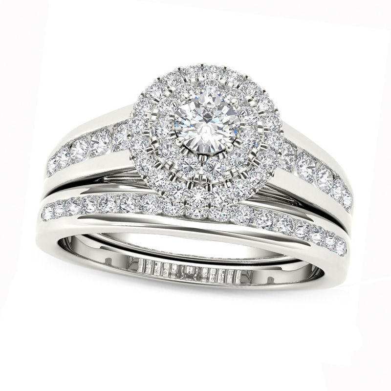 This 14K white gold bridal set radiates elegance and romance. The engagement ring is expertly crafted, featuring a stunning round 1/5 ct. diamond center stone surrounded by a double frame of sparkling accent diamonds. The shank is also adorned with channel-set diamonds, adding even more brilliance to this breathtaking piece. The accompanying wedding band is adorned with channel-set accent diamonds, perfectly completing the set. With a total diamond weight of 1 ct. and a polished finish, this bridal set is a perfect way to begin your happily ever after. Your beloved will undoubtedly cherish this beautiful symbol of your love.