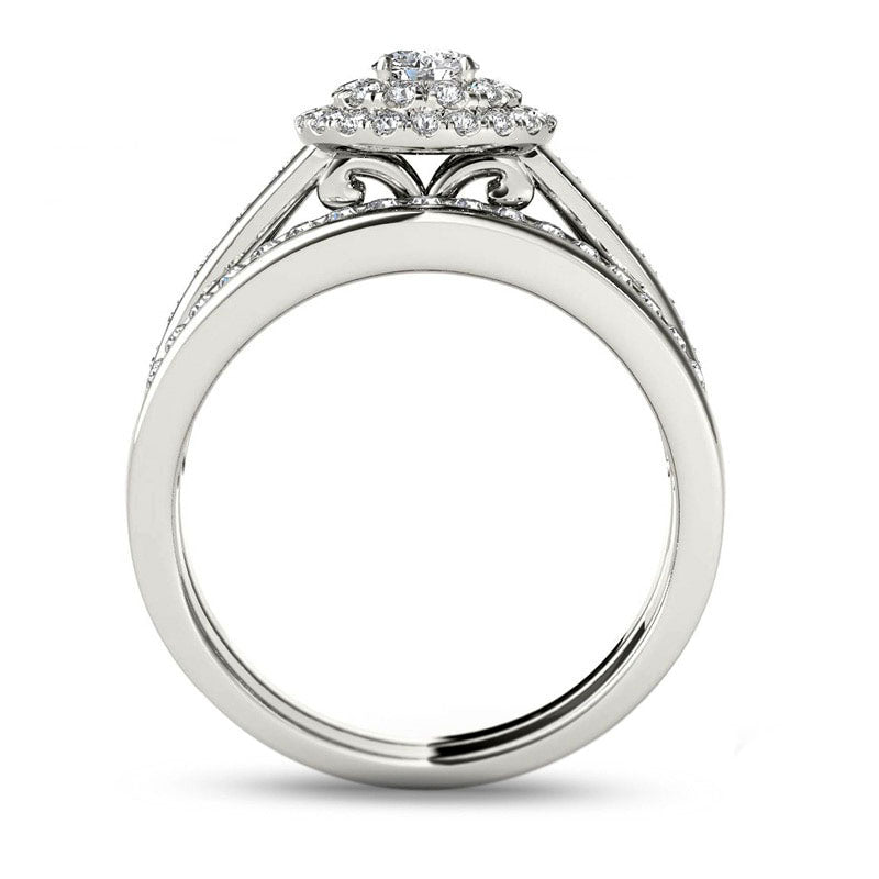This 14K white gold bridal set radiates elegance and romance. The engagement ring is expertly crafted, featuring a stunning round 1/5 ct. diamond center stone surrounded by a double frame...