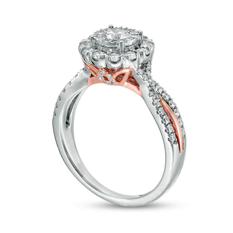 Looking for the perfect engagement ring? Look no further than this stunning piece. Crafted from 14K two-tone gold, it features a dazzling 1/4 ct. diamond at the center, surrounded by two diamond-adorned frames. The white gold shank is decorated with even more diamonds, while a polished rose gold ribbon adds color and dimension to the design. Radiant with 1 ct. t.w. of diamonds and a brilliant buffed luster, this ring is sure to take her breath away. Available in size 7 only, this engagement ring is a true showstopper.