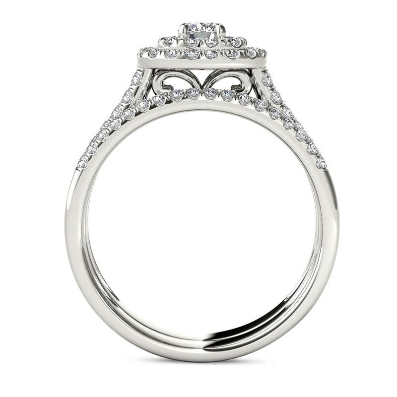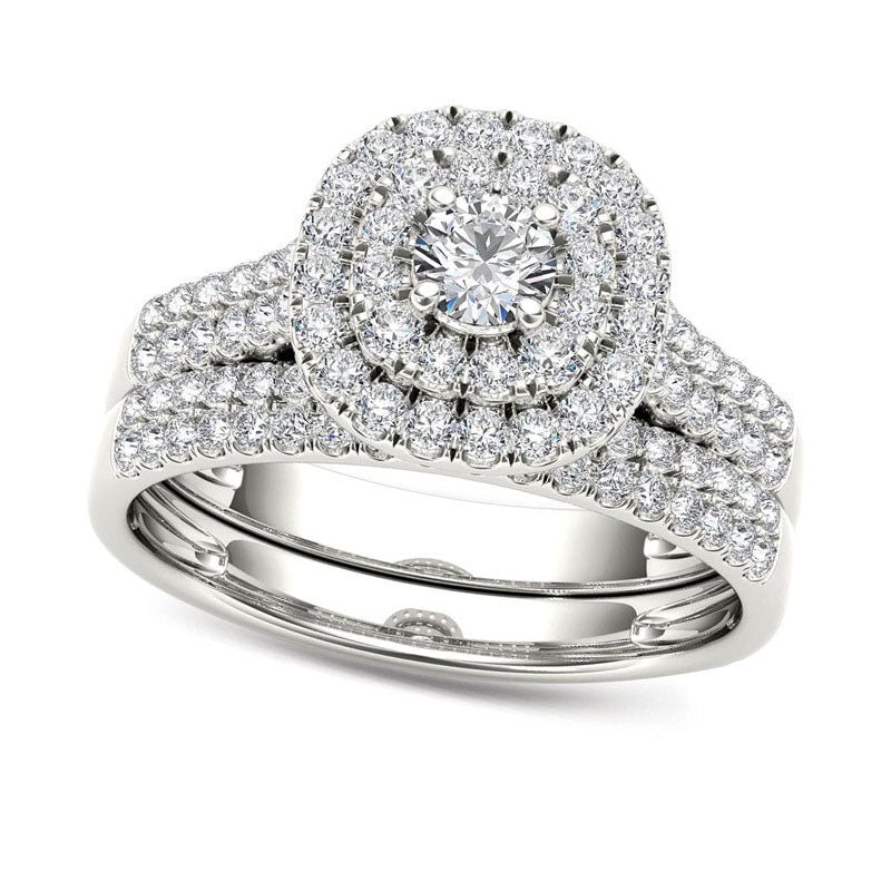 Make your proposal unforgettable with this stunning diamond bridal set. Crafted from sleek 14K white gold, the engagement ring showcases a brilliant 1/4 ct. round-cut diamond at its center. The diamond is framed by a double cushion-shaped halo of smaller diamonds, while more diamonds line the ring's double shank for added elegance. The coordinating wedding band features two rows of sparkling diamonds that complement the engagement ring perfectly. With a total weight of 1 ct., this bridal set is guaranteed to steal the show. Its timeless design is finished with a smooth, polished shine that will sparkle on your finger for a lifetime.