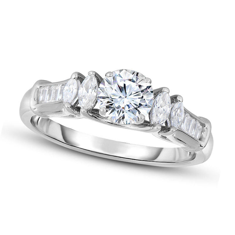 This stunning diamond engagement ring will take her breath away. Crafted in elegant 14K white gold, the five-stone design flaunts a brilliant 3/4 ct. diamond centerpiece, accompanied by pairs of marquise-cut diamonds on either side. The shank of the ring boasts rows of shimmering, channel-set baguette-cut diamonds, adding an extra touch of glamour. Adorned with a total of 1 ct. t.w. of diamonds and finished with a lustrous polish, this engagement ring is a true masterpiece that she will treasure for years to come.