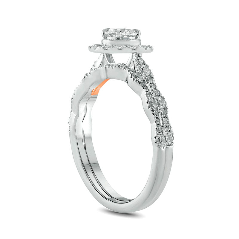 This stunning diamond bridal set offers a vintage-inspired design that will capture her heart. Crafted from 10K two-tone gold, the exquisite engagement ring showcases a spectacular 1/3 ct. diamond that sparkles within a diamond frame, accentuated by intricate milgrain detailing. The white gold shank dazzles with a scalloped row of varying-sized diamonds and milgrain lining. A hidden surprise awaits within the rose gold gallery detail, adding a delightful pop of color. In perfect harmony with the engagement ring, the coordinating wedding band features a matching scalloped design punctuated by milgrain detailing and multi-sized diamonds. This cherished bridal set boasts an impressive total of 1 ct. T.W. of diamonds, giving it a brilliant, polished shine. It is a true symbol of love and devotion that she will cherish forever.